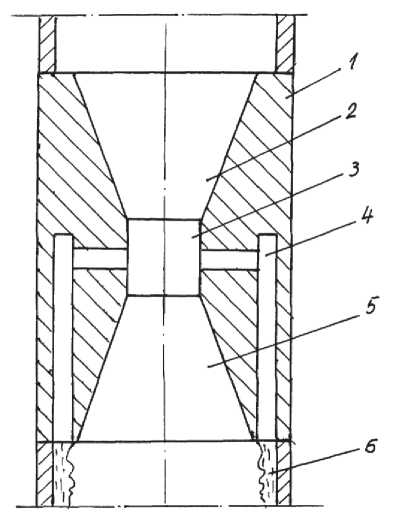 Рис. 1. Диспергатор для выноса водных скоплений из газовых скважин [20] (1 – корпус; 2, 5 – усеченные конусы; 3 – цилиндрическая вставка; 4 – каналы)