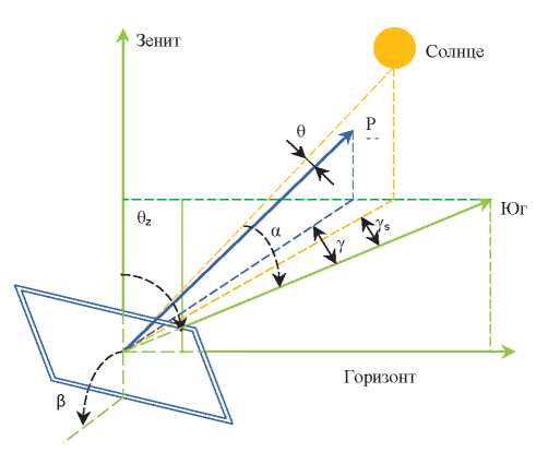 где θ – угол между прямыми лучами Солнца и вектором PV (рис. 1), перпендикулярным поверхности ФЭП. Угол может быть найден по известной формуле [30]: