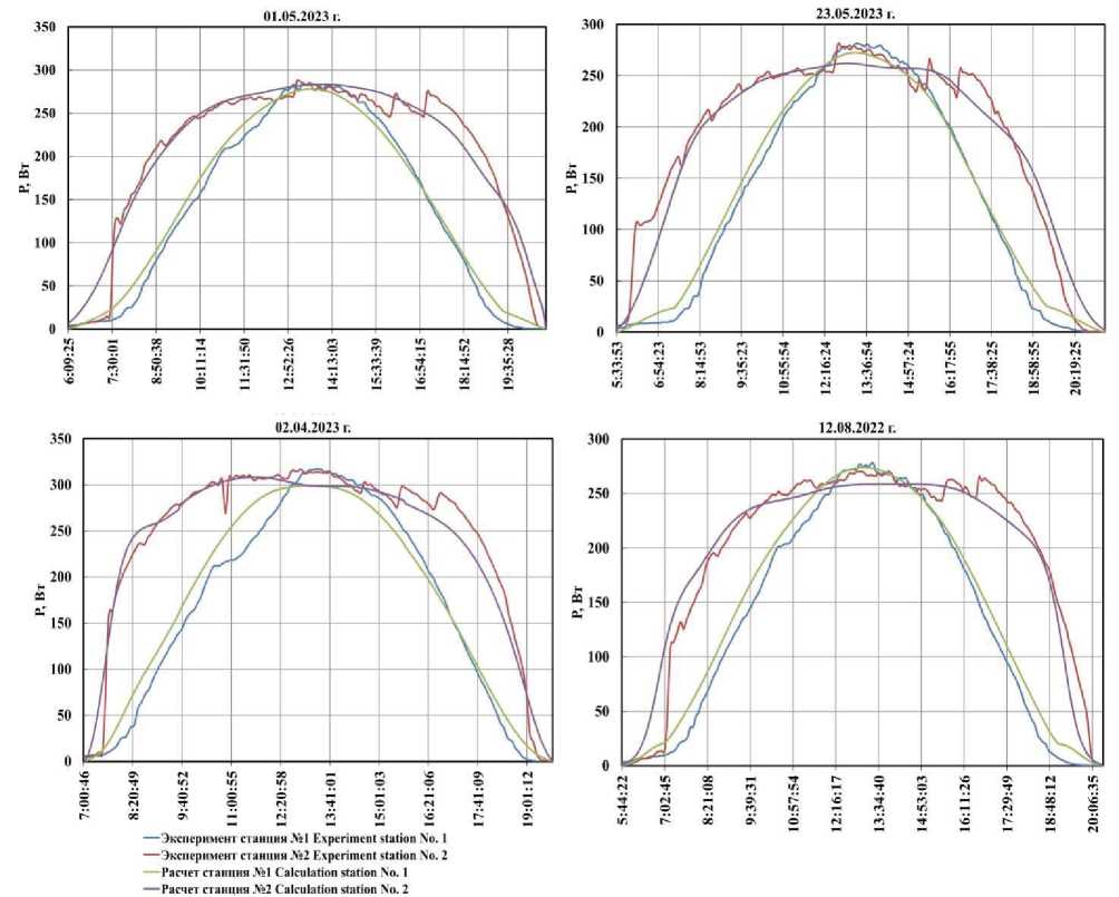 Результаты исследований для всех рассматриваемых ясных или малооблачных дней с указанием математических моделей сведены в табл. 6. В ней представлены расчетные значения выработанной электроэнергии Wpv, экспериментальные значения выработанной электроэнергии We с неподвижными (станция № 1) и подвижными ФЭП (станция № 2), определенные по формулам (40), (42)–(45), с наименьшей погрешностью.