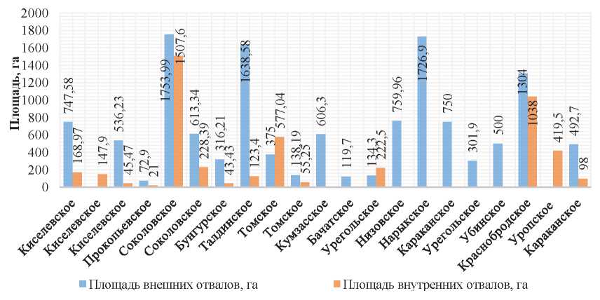 Согласно анализу проектной документации по угольным разрезам Кемеровской области, порядок отработки оказывает основное влияние на изъятие земель под промышленное назначение. Подавляющее большинство угольных разрезов Кузбасса применяет углубочную продольную одно- или двухбортовую систему разработки (по классификации, предложенной академиком В.В. Ржевским) [5]. При отработке наклонных и крутопадающих угольных залежей использование углубочных систем открытой разработки приводит к необходимости размещения пород вскрыши на внешних отвалах [4]. Как видно из графика на рис. 2, площади, занимаемые внешними отвалами, значительно превышают площади, занимаемые внутренними отвалами, а в некоторых случаях о внутренних отвалах речи и не идет. С учетом представленных данных доля площадей, занимаемых внутренним отвалообразованием, составляет порядка 26,5 %.