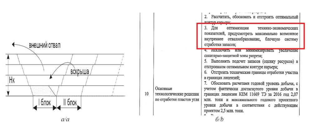 В настоящее время при разработке проектной документации все большее число угольных разрезов старается внедрять технологии отработки с использованием внутреннего отвалообразования. Так, угольные разрезы при разработке проектов на освоение участков недр все чаще делают акцент на ресурсосберегающих технологиях с использованием внутреннего отвалообразования. Например, при разработке проектной документации на отработку и утверждение запасов полезного ископаемого недропользователем в техническом задании указаны требования проектной документации с участием блокового способа разработки карьерного поля (рис. 3, б).