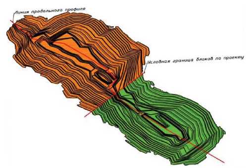 Рис. 4. Общий вид карьерного поля с делением на блоки при разработке перспективного участка Киселевского каменноугольного месторождения