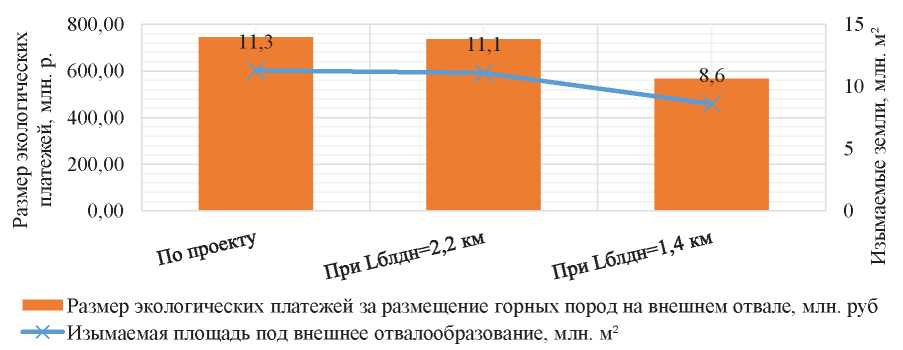 В дальнейшем к сравнению предлагаются варианты: по проектной документации; при максимальных и минимальных параметрах блоков. По результатам расчета землеемкости разреза, с учетом среднего значения объема вскрышных пород, приходящихся на 1 га площади, по трем принятым вариантам выявлено явно выраженное снижение уровня изымаемых земель, что сопровождается снижением размера экологических платежей (рис. 5).