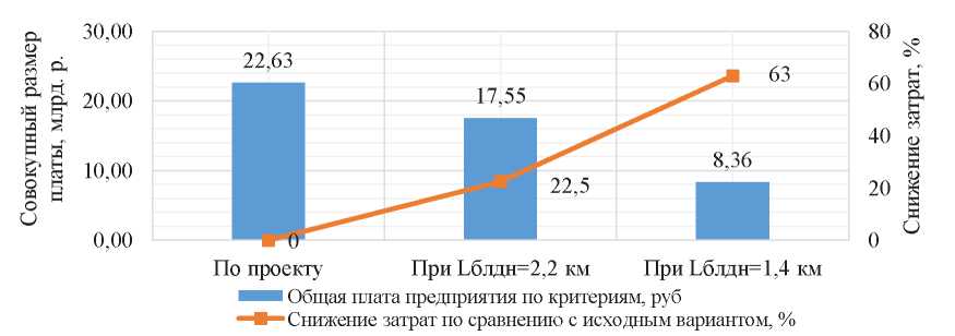 Рис. 8. График изменения совокупной платы за воздействие на окружающую среду и процента снижения затрат от размеров блоков