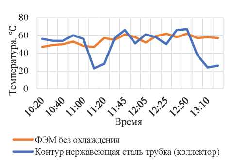 Из графика (рис. 12) видно, что наиболее близкой системой по температуре к эталонному ФЭМ без охлаждения является система с медной трубкой и нержавеющей трубкой. Освещенность во время измерений 13:25 составляла 70 Вт/м2, тогда как освещенность для системы из нержавеющей стали в 12:30 составила 820 Вт/м2.