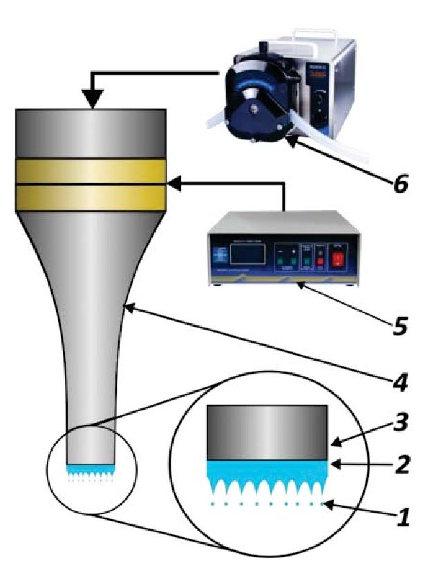 На практике процесс ультразвукового распыления реализуется при помощи распылителей, которые состоят из ультразвуковой колебательной системы – 4, электронного генератора для питания колебательной системы – 5 и системы подачи распыляемой жидкости – 6. Ультразвуковая колебательная система (УЗКС) при помощи пьезоэлектрических элементов преобразует колебания питающего её электрического напряжения в механические колебания рабочего (распылительного) окончания. Ультразвуковой генератор обеспечивает преобразование энергии промышленной сети в энергию электрических колебаний с частотой, соответствующей резонансной частоте ультразвуковой колебательной системы. Кроме этого, электронный генератор обеспечивает стабилизацию амплитуды механических колебаний (за счет изменения выходного напряжения) и автоматическую подстройку частоты выходного напряжения в соответствии с любыми изменениями параметров УЗКС.