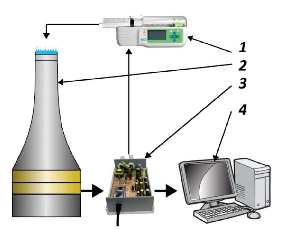 На рис. 3 представлен стенд для проведения экспериментальных исследований. Стенд включает в себя ультразвуковую колебательную систему – 2, измерительный модуль – 3 для получения амплитудно-частотных характеристик (АЧХ), подключенный к персональному компьютеру – 4, и дозатор для подачи распыляемой жидкости – 1.