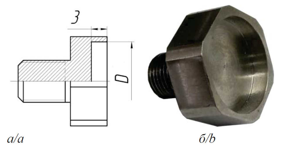 Для обеспечения возможности удержания на распылительной поверхности слоя жидкости произвольной толщины колебательная система располагалась распылительным окончанием вверх. Распылительное окончание имеет чашеобразную форму, позволяющую удерживать необходимый объем жидкости. Распылительные окончания были выполнены сменными. На рис. 4 приведены чертеж и фотография одного из тестовых распылительных окончаний.