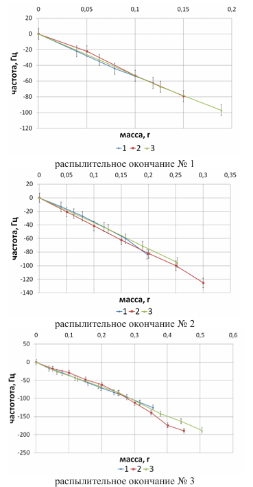 Поскольку на резонансную частоту механических систем оказывает влияние их температура, для уменьшения связанной с температурой погрешности каждая серия экспериментов проводилась при одной и той же температуре колебательной системы. Результаты изменения резонансных частот ультразвуковых распылительных систем от массы модельной жидкости на поверхности распылительного окончания показаны на рис. 5.