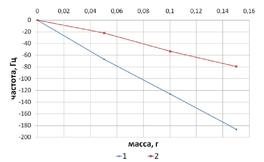 Рис. 7. Зависимость изменения резонансных частоты УЗКС от массы модельной жидкости: 1 – 44кГц, 2 – 22кГц