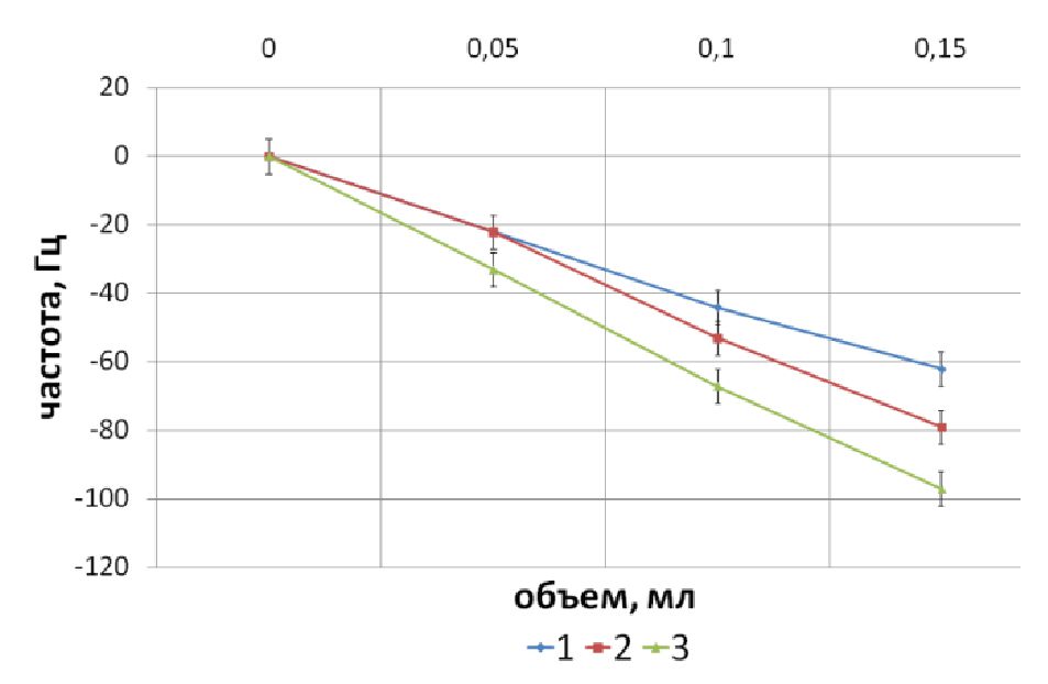 Fig. 8. Change in the resonant frequency depending on liquid volume: 1 – ethanol, 2 – water, 3 – glycerin