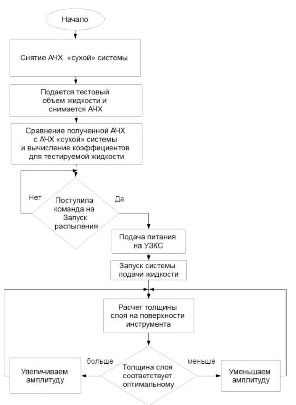 Алгоритм основан на регистрации изменения резонансной частоты распылительной УЗКС в процессе распыления. После включения аппарата, пока распылительное окончание УЗКС «сухое», производится измерение собственной резонансной частоты колебательной системы. После этого при помощи дозатора (который должен управляться централизованно с ультразвуковым генератором) на распылительное окончание подается тестовый объем жидкости и производится измерение резонансной частоты. На основании изменения резонансной частоты от тестового объема жидкости, объема поданной жидкости и площади распылительного окончания вычисляются коэффициенты для поданной жидкости, позволяющие устанавливать связь резонансной частоты и толщины слоя жидкости на поверхности распылительного окончания. После запуска процесса распыления аппарат поддерживает оптимальную (заданную для текущей распыляемой жидкости) толщину слоя жидкости, при этом при изменении расхода жидкости алгоритм изменяет амплитуду УЗ-колебаний распылительного окончания, поддерживая требуемую толщину слоя жидкости.