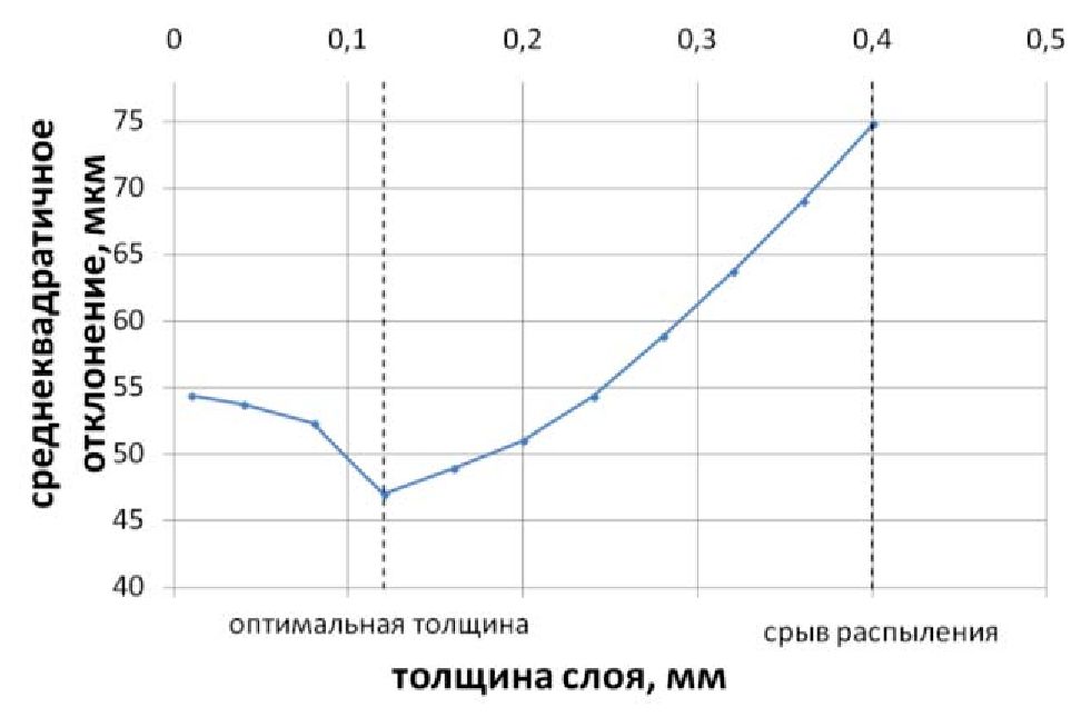 Для проверки эффективности алгоритма управления процессом ультразвукового распыления была получена зависимость среднеквадратичного отклонения формируемых капель от толщины слоя жидкости. Частота ультразвукового воздействия равнялась 22 кГц. Средний диаметр формируемых капель был равен 80 мкм. Зависимость показана на рис. 10.