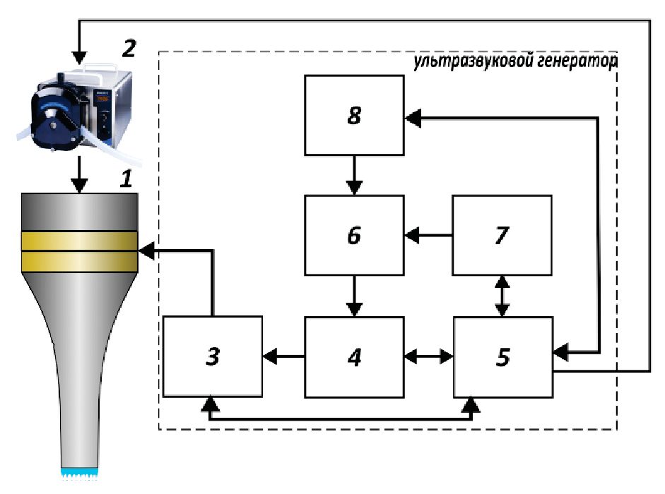 Рис. 11. Структурная схема распылителя с автоматическим поддержанием толщины слоя распыляемой жидкости: 1 – ультразвуковая колебательная система, 2 – система подачи распыляемой жидкости, 3 – измерительный блок, 4 – блок согласования, 5 – управляющий микроконтроллер, 6 – силовой каскад, 7 – управляемый задающий генератор, 8 – управляемый источник питания