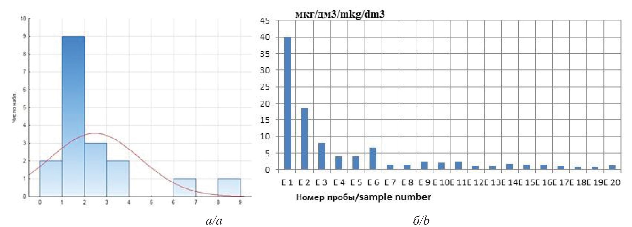 Рис. 5. Гистограммы распределения свинца по концентрации (а) и по месту отбора проб снега (б)