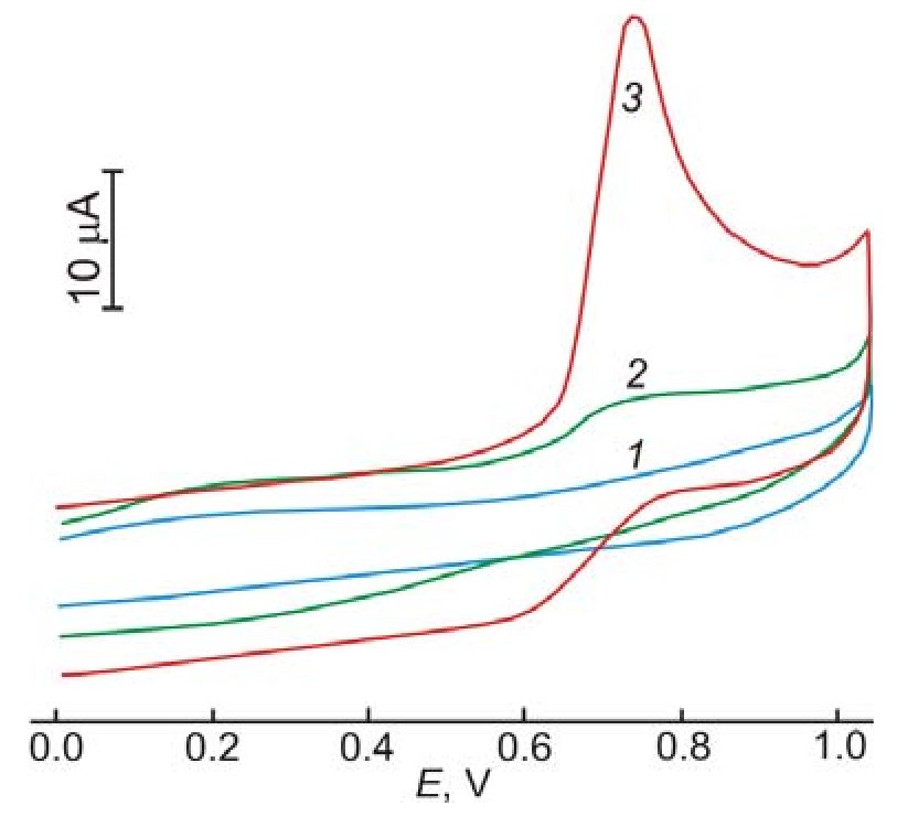 Рис. 3. Циклические вольтамперограммы композитного полимер-углеродного электрода (1) в фоновом электролите 0,1 М KNO3, (2) в растворе соли гидразина 6×10–4 М N2H4×H2SO4+0,1 М KNO3 и (3) модифицированного частицами золота электрода в растворе 6×10–4 М N2H4×H2SO4+0,1 М KNO3 (w=50 мВ/с; деаэрирование растворов азотом)