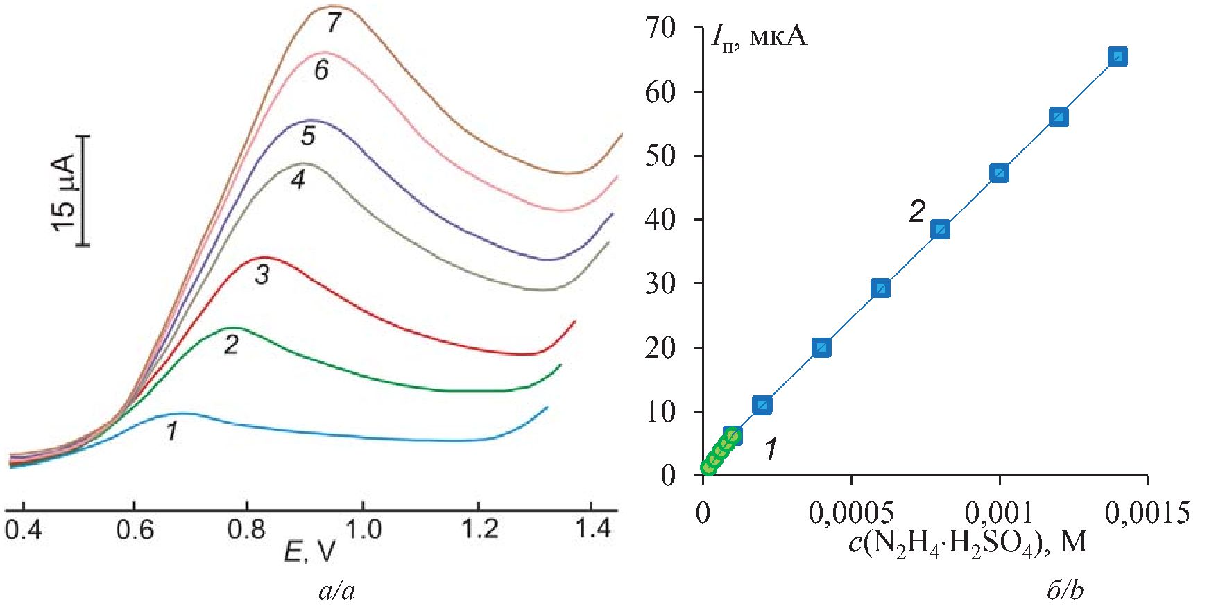 Рис. 4. Анодные вольтамперограммы (а) композитного полимер-углеродного электрода, модифицированного частицами золота, в растворах N2H4×H2SO4+0,1 М KNO3 при различных концентрациях соли гидразина: 1) 2×10–4; 2) 4×10–4; 3) 6×10–4; 4) 8×10–4; 5) 1×10–3; 6) 1.2×10–3; 7) 1.5×10–3 М и (б) зависимости величины пика анодного тока от концентрации в растворах 1) 1·10–5…1·10–4 and 2) 1·10–4…1.5·10–3 M N2H4×H2SO4 (w=50 мВ/с; деаэрирование растворов азотом)