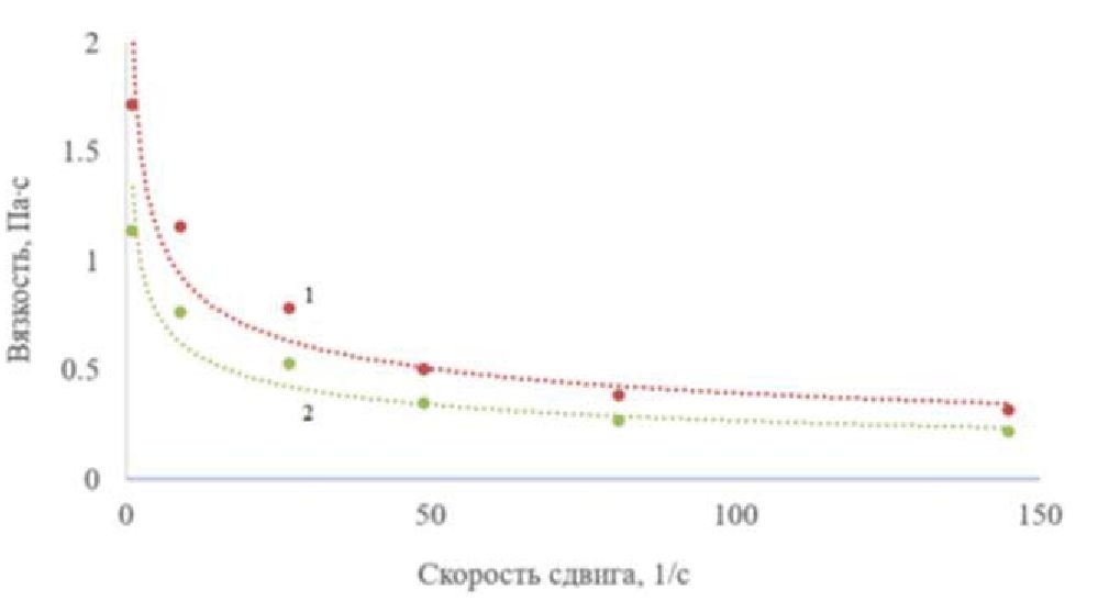 Методом ротационной вискозиметрии были определены вязкости исходной водонефтяной эмульсии Арчинского месторождения и эмульсии после введения в неё деэмульгатора. Установлено, что вязкости этих образцов уменьшаются при увеличении скорости сдвига, что является следствием действия силы трения, возникающей между слоями движущихся жидкостей. При повышении температуры и скорости сдвига, задаваемых в измерительном зазоре ротационного прибора, происходит разрушение крупных надмолекулярных структур (мицелл и ССЕ) до индивидуальных молекул. Неньютоновское поведение нефти особенно заметно при низкой температуре, при которой интенсивность броуновского движения молекул дисперсионной среды невелика. Поэтому в системе, находящейся в покое или при малых скоростях сдвига, присутствуют неразрушенные надмолекулярные ассоциаты, состоящие в основном из молекул парафинов, асфальтенов и смол, которые связаны между собой относительно слабыми силами межмолекулярного взаимодействия. Исходная водонефтяная эмульсия Арчинского месторождения, а также нефть с деэмульгатором при изменении скорости сдвига обладают заметными неньютоновскими свойствами (рис. 1). Меньшее значение вязкости нефти с добавкой деэмульгатора обусловлено частичным разрушением эмульсии даже при комнатной температуре.