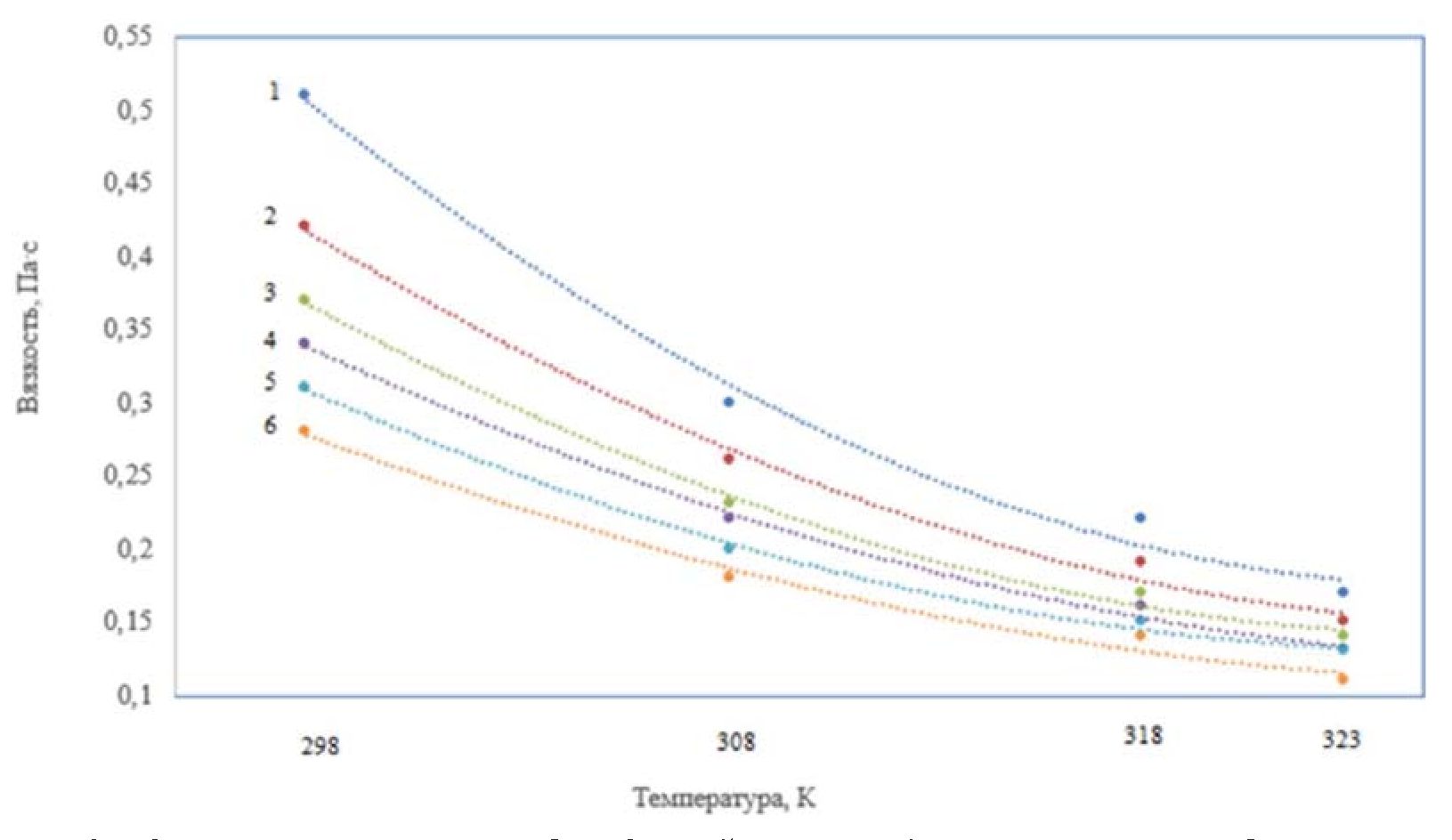 Рис. 2. Зависимость вязкости водонефтяной эмульсии Арчинского месторождения от температуры при разных скоростях сдвига: 1 – γ1=45 с–1; 2 – γ2=67 с–1; 3 – γ3=89 с–1; 4 – γ4=112 с–1; 5 – γ5=134 с–1; 6 – γ6=178 с–1