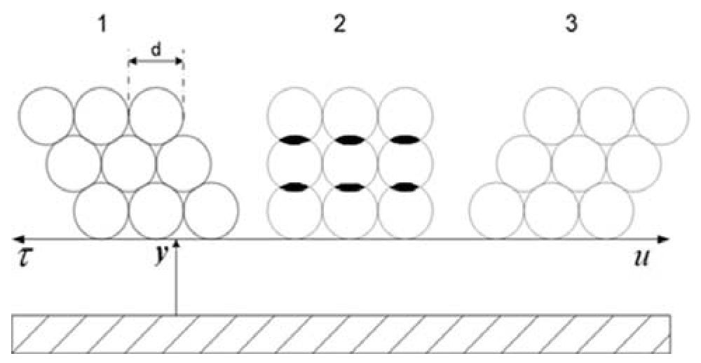 При сдвиговом течении слои жидкости по мере удаления их на расстояние (У, У+d, У+2d и т. д.) от неподвижной границы измерительного оборудования движутся с возрастающей скоростью (U, U+Δu, U+2Δu и т. д.) и «обгоняют» друг друга (рис. 4), поэтому между ними возникают градиент скорости (скорость сдвига) и сила трения, которая по направлению противоположна вектору скорости и при её отнесении к единице поверхности трения смежных слоев называется напряжением сдвига (τ=FТР/S). Причиной возникновения напряжения сдвига между слоями реальной жидкости является наличие вокруг атомов и состоящих из них молекул отрицательно заряженного электронного облака. Как видно из рис. 4, при слоистом течении жидкости все её фрагменты постоянно участвуют в периодических переходах из одного равновесного состояния (1) в другое равновесное состояние (3) с минимумом энергии, в которых реализована максимально плотная упаковка молекул в постоянном объёме изображенного фрагмента несжимаемой жидкости (V1=V3=const). Этот переход осуществляется через стесненное состояние (2), которое также имеет объём V2, равный объёмам V1 и V3. Но в промежуточном (переходном) состоянии (2) имеются зоны перекрывания одноименно заряженных внешних сфер частиц жидкости, что приводит к взаимному отталкиванию и появлению силы трения, следствием которой становится тепловыделение при течении жидкости. Трение и сопутствующее тепловыделение при слоистом течении сопровождается частичным разрушением энергетически непрочных ССЕ и изменением размеров микрокапель водонефтяной эмульсии. Для перевода любого фрагмента жидкости при слоистом течении из равновесного состояния 1 в другое равновесное состояние 3 требуется его переход через напряженное состояние 2, и, следовательно, необходима некоторая избыточная энергия, которая, согласно активационной теории Аррениуса–Френкеля–Эйринга, называется энергией активации вязкого течения (Е).