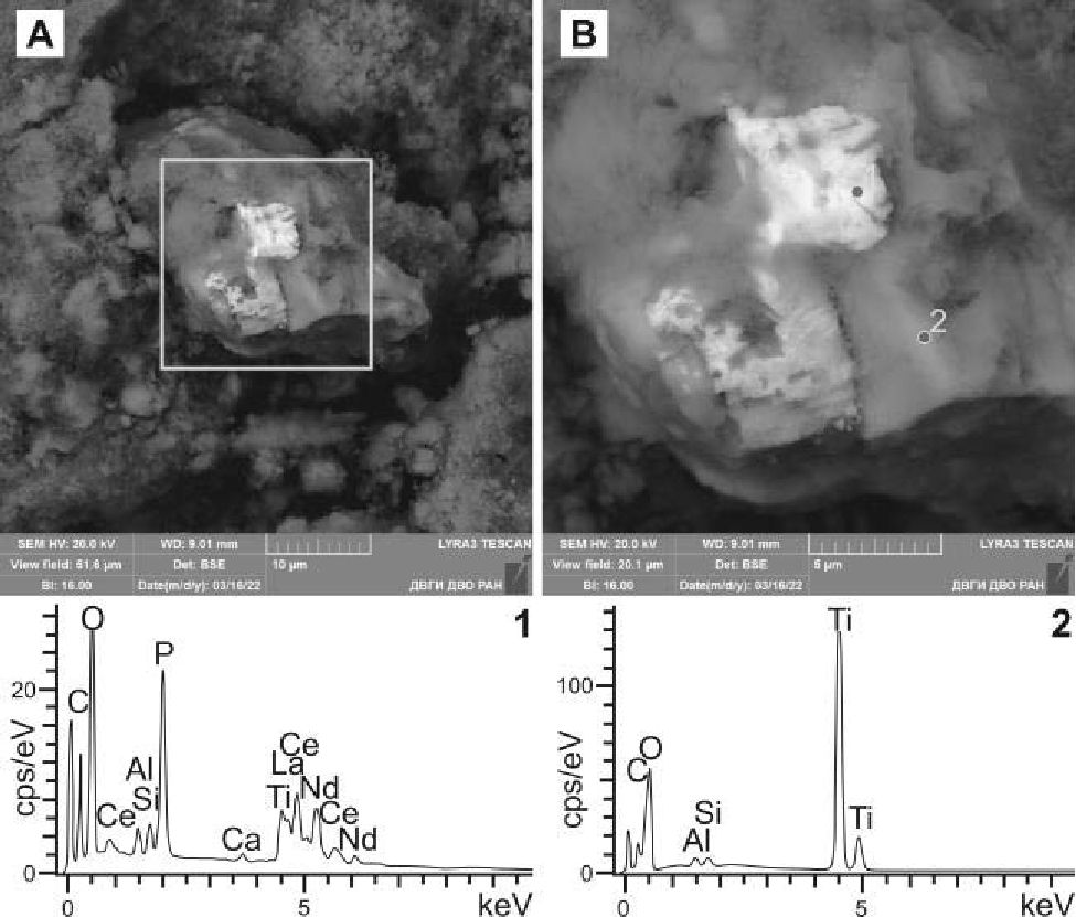 6. Fig. 5. A) Monazite-(Ce) aggregate on a TiO2 grain; B) enlarged fragment showing monazite-(Ce) on the surface of ilmenite grain; 1 and 2 – EDS spectra of points 1 and 2 on Fig. 5, B, respectively