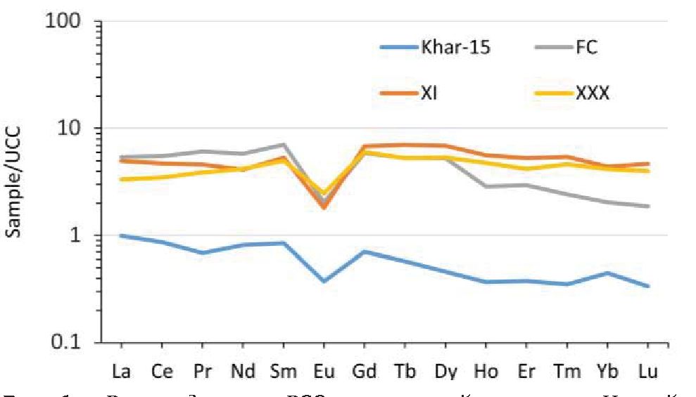 7. Fig. 6. REE distribution in the tonstein of the Novy-1a seam (Khar-15), in the Fire Clay (FC) tonstein, in the parting of the XI Kuzbass seam (XI), and in the parting of the XXX–XXXa seams in the Minusinsk Basin (XXX). Normalized to the Clarke value in the upper continental crust [22]