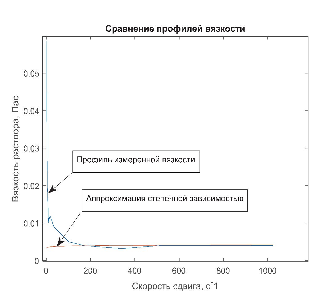 Рис. 1. Сравнение профиля измеренной вязкости раствора и аппроксимированной по степенному закону