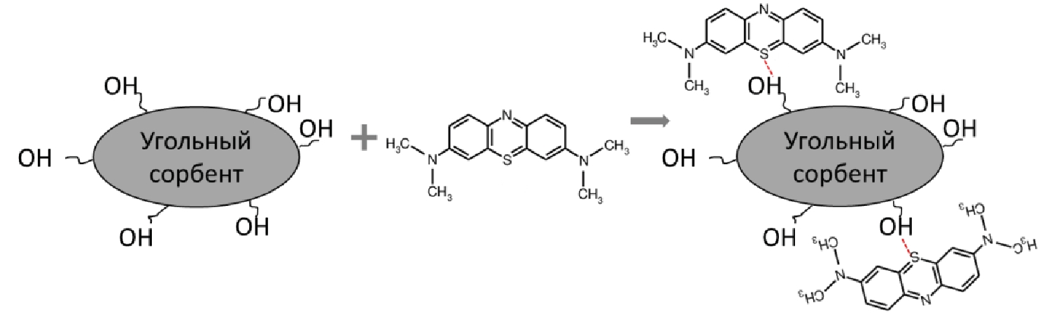 Как мы видим, активация привела к увеличению сорбционной емкости при активации перекисью в 1,7 раза и при активации паром в 1,8 раза. Активация перекисью и серной кислотой дала значительный рост сорбционной емкости образца по метиленовому синему. Данный результат кажется парадоксальным, но, как известно из литературных источников, механизм сорбции метиленового синего из растворов в большей степени обусловлен хемосорбцией за счет образования химической связи активными центрами сорбента, а не физической сорбцией за счет межмолекулярных сил. Наличие окислительной среды и пониженная pH при использовании смеси перекиси и серной кислоты обеспечивают формирование на поверхности сорбента OH-групп, которые активно включаются в процесс сорбции красителя. Предполагаемый механизм сорбции [19] представлен на рис. 2.
