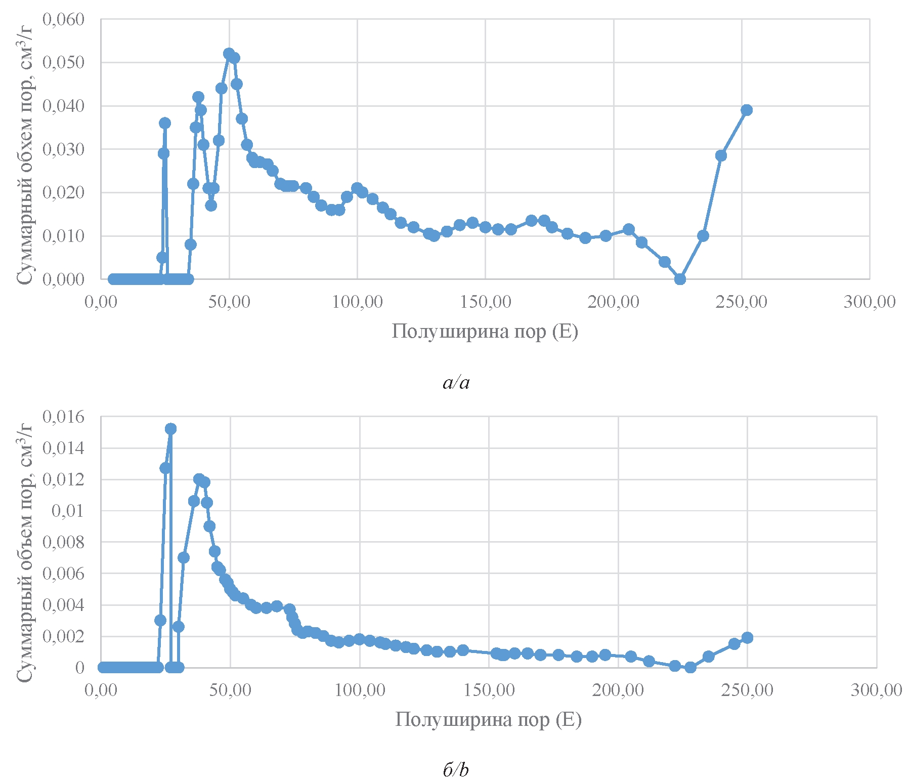 При рассмотрении результатов, представленных в табл. 4, можно сделать выводы, что суммарный объем пор и удельная площадь поверхности по БЭТ в 5,6 и 2,7 раза, соответственно, выше у гидроугля, активированного термически (паром), в сравнении с химически активированным образцом. При этом данный сорбент имеет более разнообразную пористую структуру (рис. 3), с преобладанием мезопор.