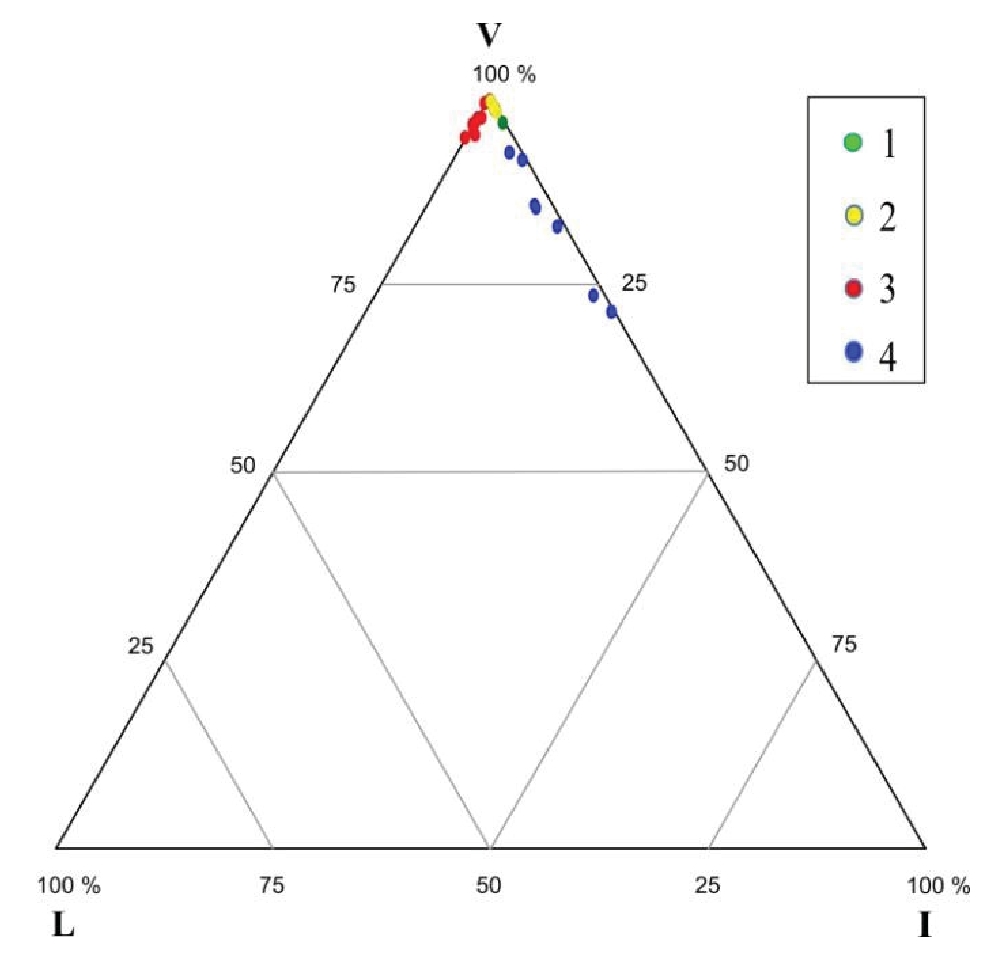 Рис. 1. Компонентный состав органического вещества углей пласта Улуг Улуг-Хемского бассейна: 1 – Элегестское, 2 – Межегейское, 3 – Каа-Хемское месторождения, 4 – обнажение Бегреда