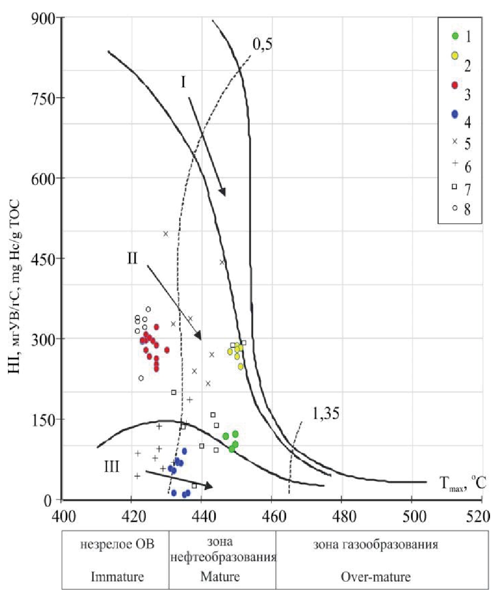 Рис. 2. Диаграмма HI–Tmax, характеризующая тип ОВ и зрелость углей и углистых пород Улуг-Хемского и других среднеюрских бассейнов: 1–4 – рис. 1; 5 – угли тюменской свиты J2tm, Западная Сибирь [12]; 6 – угли J1-2 Монголии [13]; 7 – свита Сишаньяо J2x, Джунгарский бассейн [14]]; 8 – горючие сланцы J2 Монголии [13]