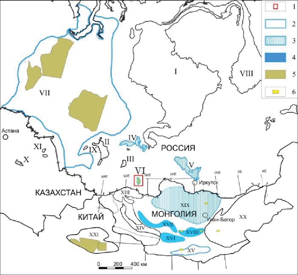 Fig. 3. Contour map of coal-bearing basins and potential for hydrocarbons areas with Middle Jurassic source rocks: 1 – studied area; J1-2 basins: 2 – coal; 3 – with thickness <750 m and/or lignites; 4 – potential for hydrocarbons with >2700–3000 m in thickness; 5 – areas with Middle Jurassic source rocks [8, 9, 12]; 6 – oil shale J1-2. Basins: I – Tunguska (C-P); II – Kuznetsky (C-P); III – Minusinsk (C-P); IV – Kansk-Achinsk (J1-2); V – Irkutsk (J1-2); VI – Ulug-Khem (J1-2); VII – West Siberian; VIII – Lensk (K); IX – Gorlovsky (C-P); X – Karaganda (C); XI – Ekibastuz (C); XII – Maikubensky (J); XIII – Harhiraa (C); XIV – Mongol-Altai (C); XV – South Gobi (P, J); XVI – Ikh-Bogd (J); XVII – Southern Khangai (P, J, K); XVIII – Ongi River (P, J, K); XIX – Orkhon-Selenga (J, K); XX – East Gobi Province (P, J, K); XXI – Junggar (P, T, J)