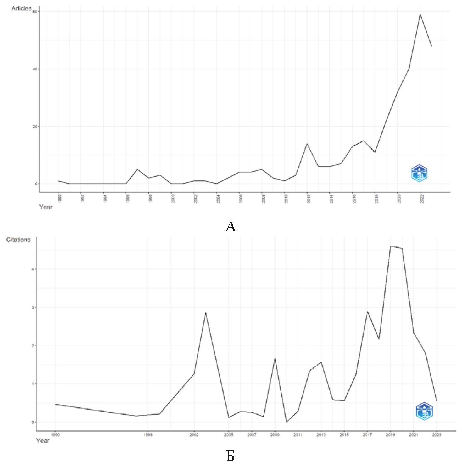 Fig. 1. Annual scientific output (A); average number of citations per year (Б)
