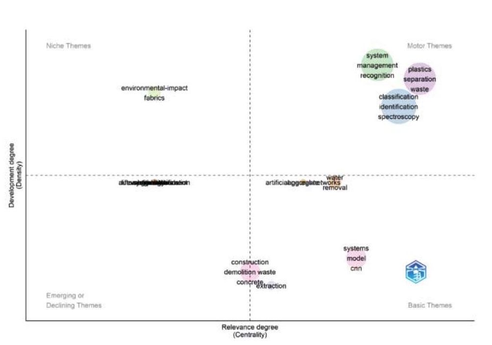 Первое направление сопровождается ключевыми словами «система», «управление», «распознавание». Второе направление – «отходы», «пластик», «разделение». Третье направление – «классификация», «идентификация» и «спектроскопия». Напротив, темы исследований в левом нижнем квадранте, с низкими значениями плотности и центральности, являются слабо разработанными или формирующимися темами, требующими дальнейшего развития. В этот кластер вошла тема «воздействие на окружающую среду».