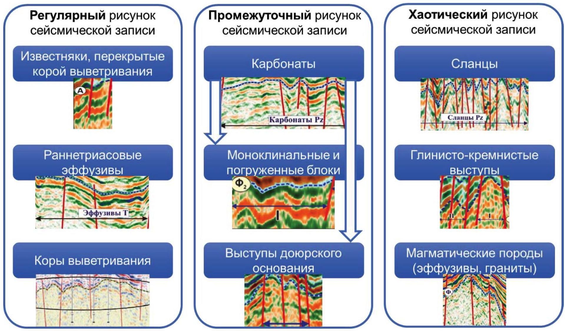 К регулярной волновой картине относятся породы, в меньшей степени подверженные метаморфическим измнениям в процессе формирования отложений доюрского комплекса. Известняки, перекрытые отложениями коры выветривания, характеризуются аномально высокими значениями сейсмических амплитуд, что связано с резким акустическим контрастом, главным образом на границе с юрскими отложениями. Раннетрисовым эффузивам свойственна слоистость и высокоамплитудные отражения, параллельные юре. Глинисто-кремнистые коры выветривания обладают резко пониженными значениями амплитуд в связи с тем, что обладают акустическими свойствами, близкими к вышележащим юрским отложениям.