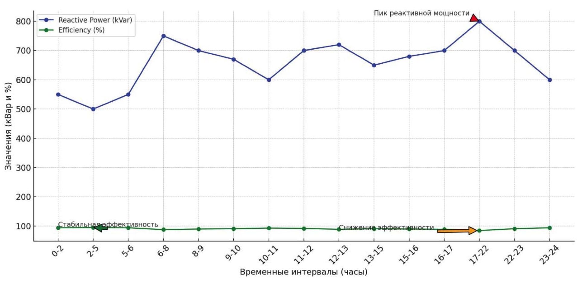 Анализ графика показал, что потребление реактивной мощности значительно влияет на эффективность работы оборудования. Суточные колебания реактивной мощности создают неравномерную нагрузку на энергосистему, что приводит к увеличению потерь активной мощности и снижению общей эффективности. В периоды пиковых нагрузок, например, с 17 до 22 часов, потребление реактивной мощности достигает максимума, что снижает эффективность работы оборудования до 85 %. Это связано с повышенной нагрузкой на КБ и увеличением токов в сети.