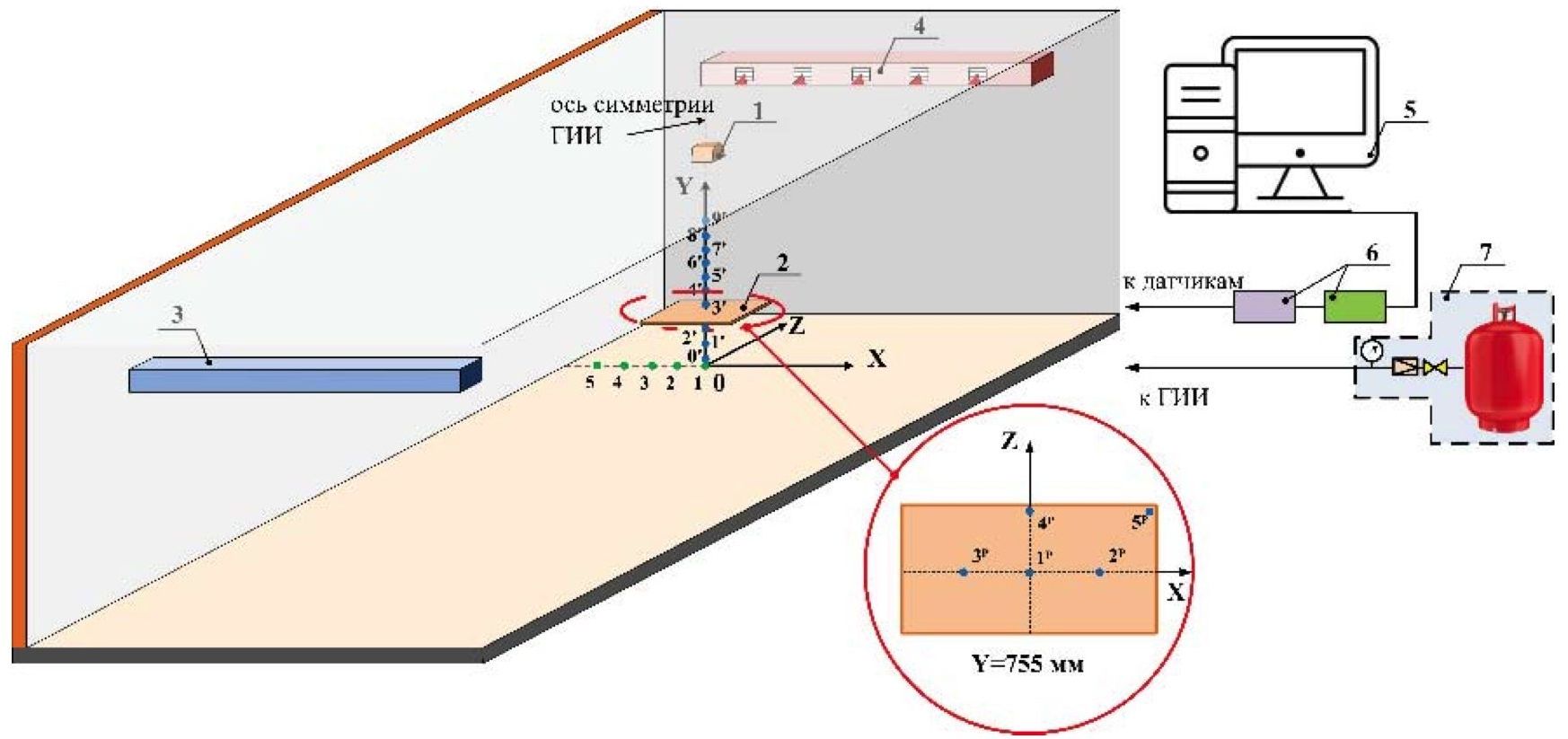 Рис. 1. Схематическое изображение области проведения экспериментов и расположения термопар: 1 – ГИИ, 2 – выносная горизонтальная панель, 3 – канал притока воздуха, 4 – канал выхода воздуха, 5 – компьютер, 6 – аналого-цифровой преобразователь и системы сбора и передачи данных, 7 – запорно-регулирующая арматура системы газоснабжения