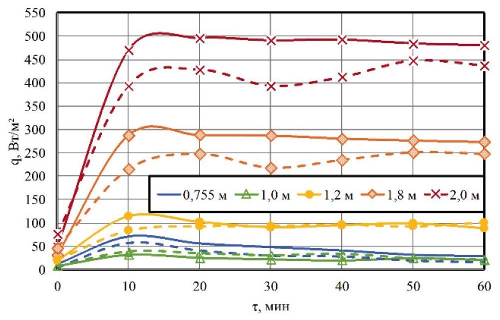 На рис. 2 приведены распределения полных тепловых потоков по высоте в центре симметрии зоны влияния ГИИ при наличии элемента оборудования (панель) в условиях естественной и смешанной конвекции.