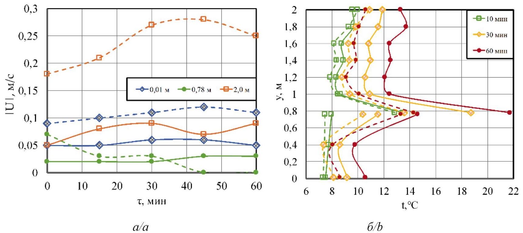 Рис. 3. Изменения с течением времени значений скорости воздуха на разных высотах (а) и распределения температур воздуха по координате Y и поверхности панели (Y=0,755 м) на оси симметрии зоны влияния ГИИ (б) в режиме естественной (сплошные линии) и смешанной (пунктирные линия) конвекции