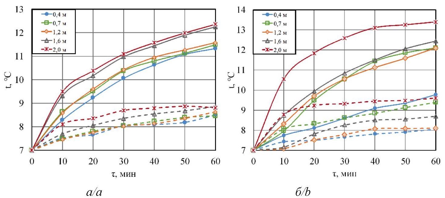 Рис. 5. Изменение температур воздуха на различных высотах в сечениях 200 мм от панели слева (а) и справа (б) в режиме естественной (сплошные линии) и смешанной (пунктирные линии) конвекции