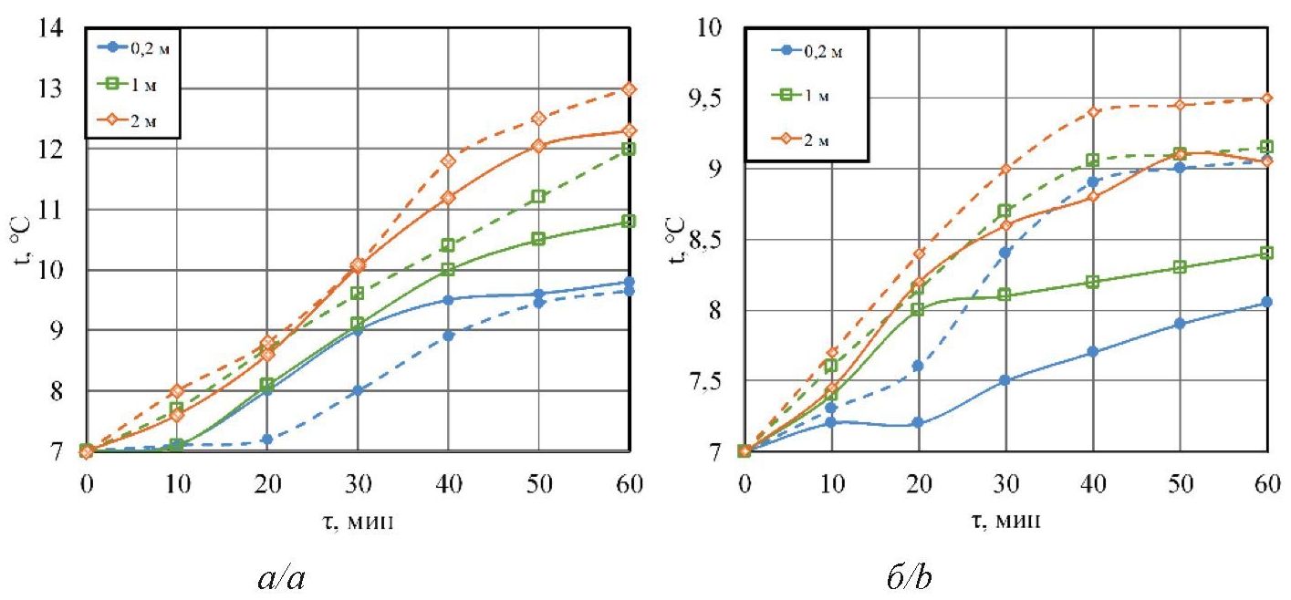 Рис. 4. Изменение температур воздуха с ростом времени в точках расположения термопар на оси симметрии зоны влияния ГИИ в режиме естественной (сплошные линии) и смешанной конвекции (пунктирные линии): а) помещение без оборудования, б) панель расположена на высоте 755 мм от пола