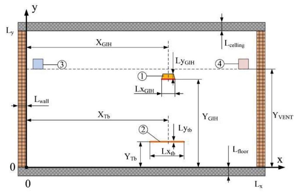 Математическое моделирование осуществлялось в рамках двумерного подхода. Рассматривалась прямоугольная область размерами Lx=10×Ly=4,4 м, ограниченная ограждающими конструкциями толщиной 0,1 м (рис. 6) и двумя горизонтальными конструктивными элементами. Также в рассматриваемой зоне расположены области, соответствующие излучателю ГИИ (размеры LxGIE=0,4 м, LyGIE=0,05 м), и панели (размеры Lxtb=0,6 м, Lytb=0,04 м). Позиционирование источника лучистой энергии (ГИИ) и горизонтальной панели в этой области было определено в соответствии с наиболее распространенными вариантами их установки в реальных помещениях, что иллюстрируется на рис. 1.