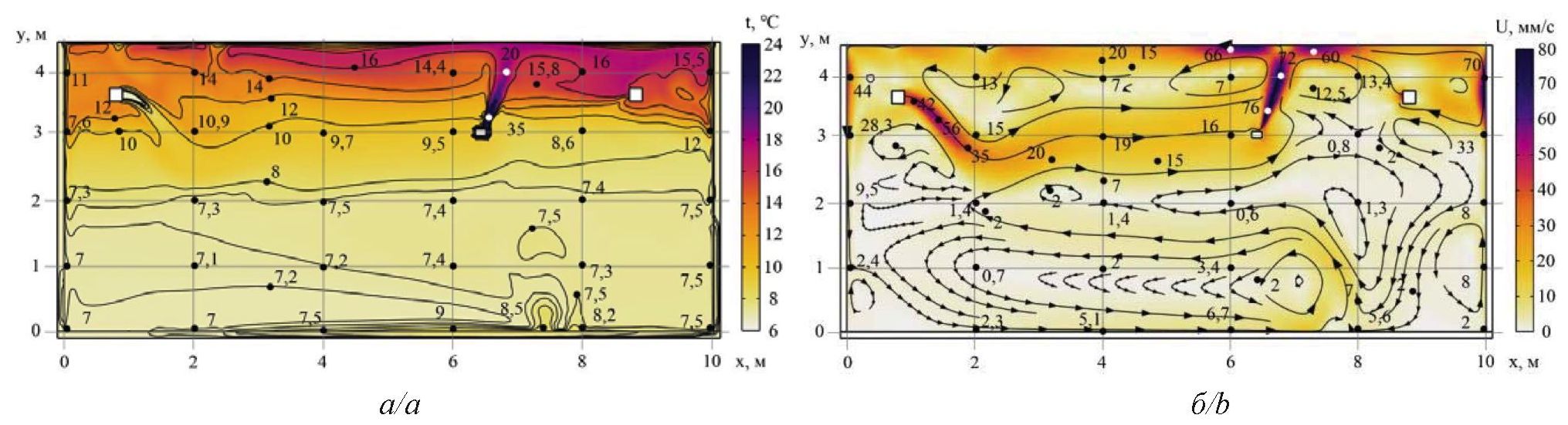 Рис. 8. Температурное поле (а) и линии тока (б) в помещении с панелью, расположенной на высоте 755 мм от пола в режиме смешанной конвекции при расходе воздуха 2×10⁻⁴ кг/(с×м³)