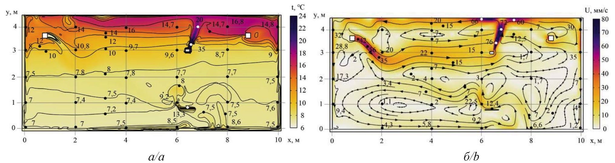 Fig. 7. Temperature field (a) and streamlines (b) in a free premise in the mixed convection condition with air flow rate of 2∙10⁻⁴ kg/(s∙m³)