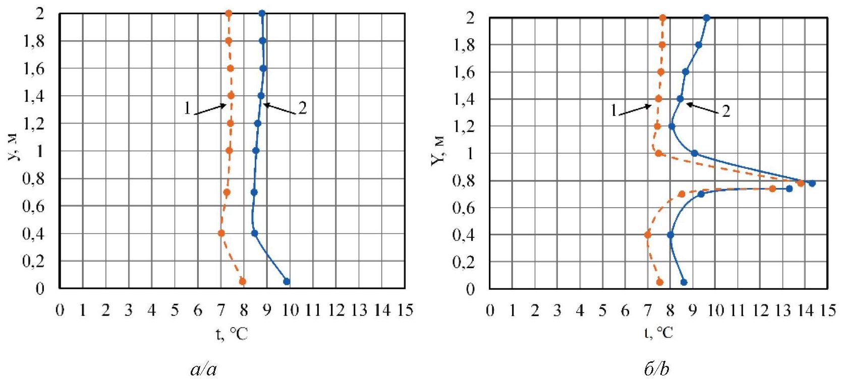 Fig. 9. Distribution of experimental (1) and theoretical (2) air temperature values along the Y coordinate on the GIH symmetry axis (τ=60 minutes): a) premise without a panel, b) premise with a panel (equipment) located at a height of 0.755 m from the floor