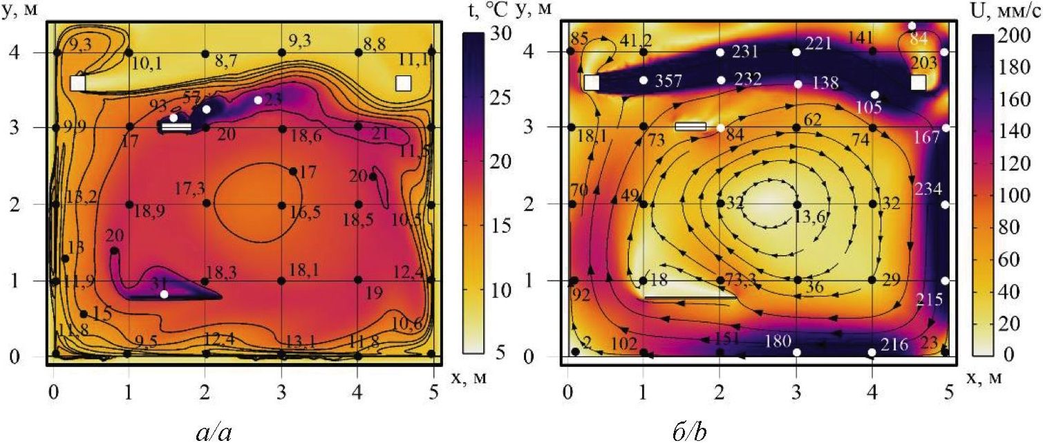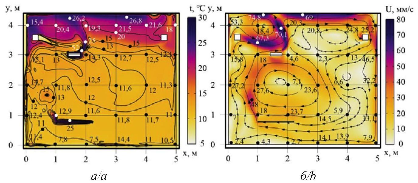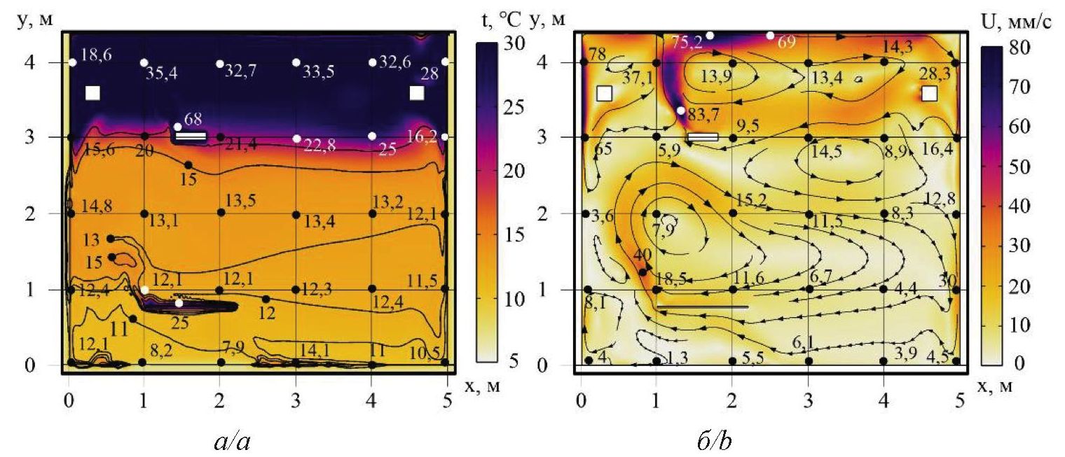 При расходе 11×10⁻⁴ кг/(с×м³), что соответствует Ri≈7,5, влияние вынужденной конвекции становится превалирующим (рис. 13). Поток относительно холодного воздуха внешней среды формирует развитое циркуляционное течение (рис. 13, б) и понижает общую температуру воздуха, во многом подавляя термогравитационную конвекцию от слабопрогревающихся стен и пола, но увеличивает среднюю температуру в локальной рабочей зоне (рис. 13, а). В этом случае температура над поверхностью оборудования увеличивается до 31 ℃. В рабочей зоне (20 см) слева и справа от панели значения температур также увеличиваются (рис. 13, а), что способствует формированию более комфортных условий работы (микроклимата).