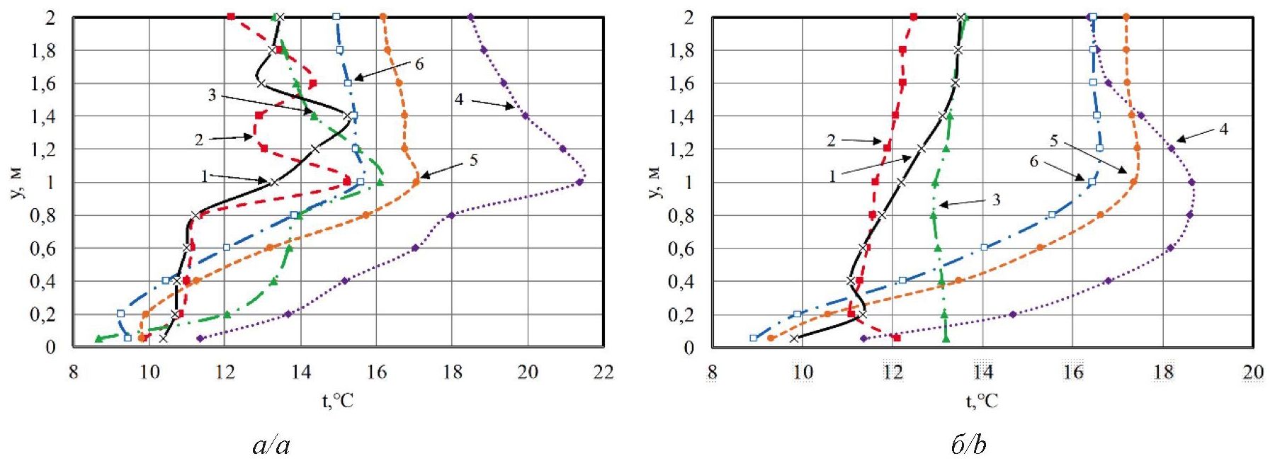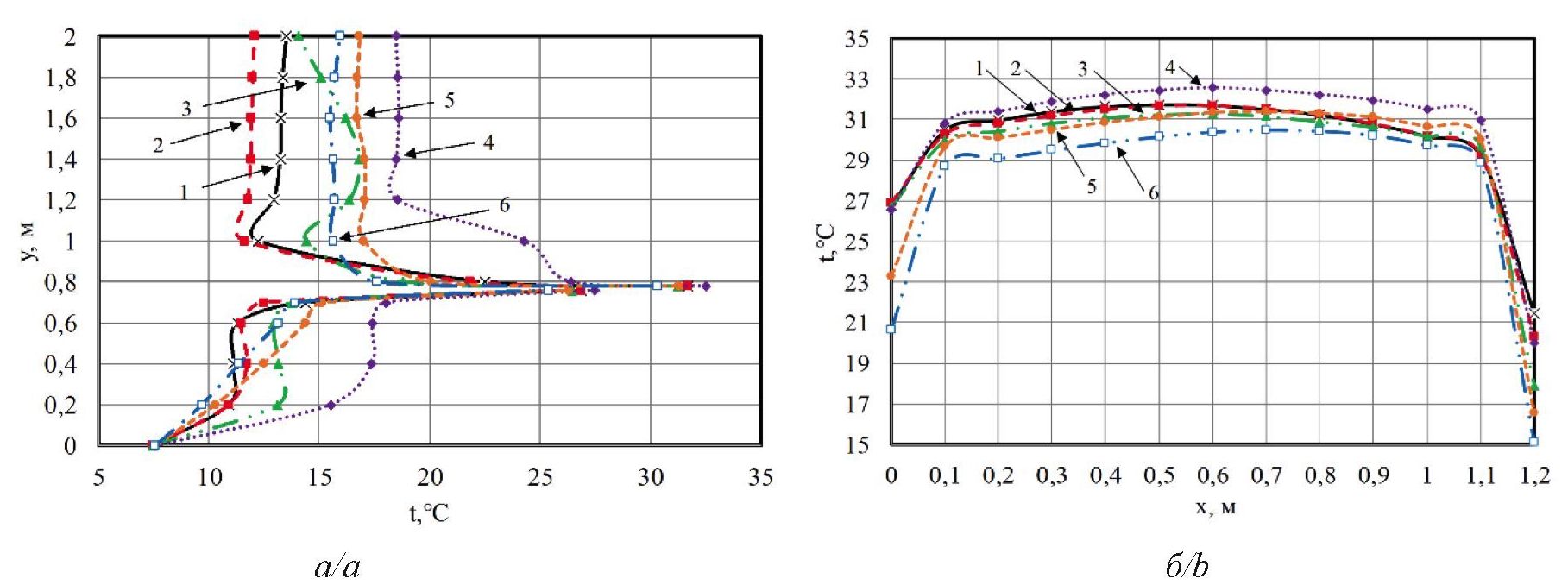 Fig. 17. Temperature distributions along the Y coordinate at distances of 0.2 m from the panel on the left (a) and right (b) at YTb=0.755 m under natural (1) and mixed convection conditions at various air flow rates, kg/(s∙m³): 2) 1×10⁻⁴, 3) 6×10⁻⁴, 4) 11×10⁻⁴, 5) 22×10⁻⁴, 6) 33×10⁻⁴