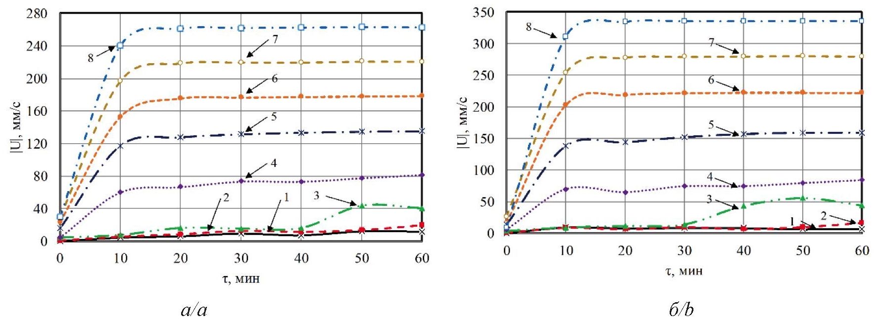 Fig. 19. Average air velocity in local working air change (0<Y<2 m) at a distance of 0.4 m from the panel on the left (a) and right (b) in time at different air flow rates, kg/(s∙m³): 1) 0; 2) 1×10⁻⁴, 3) 6×10⁻⁴, 4) 11×10⁻⁴, 5) 17×10⁻⁴, 6) 22×10⁻⁴, 7) 27×10⁻⁴, 8) 33×10⁻⁴
