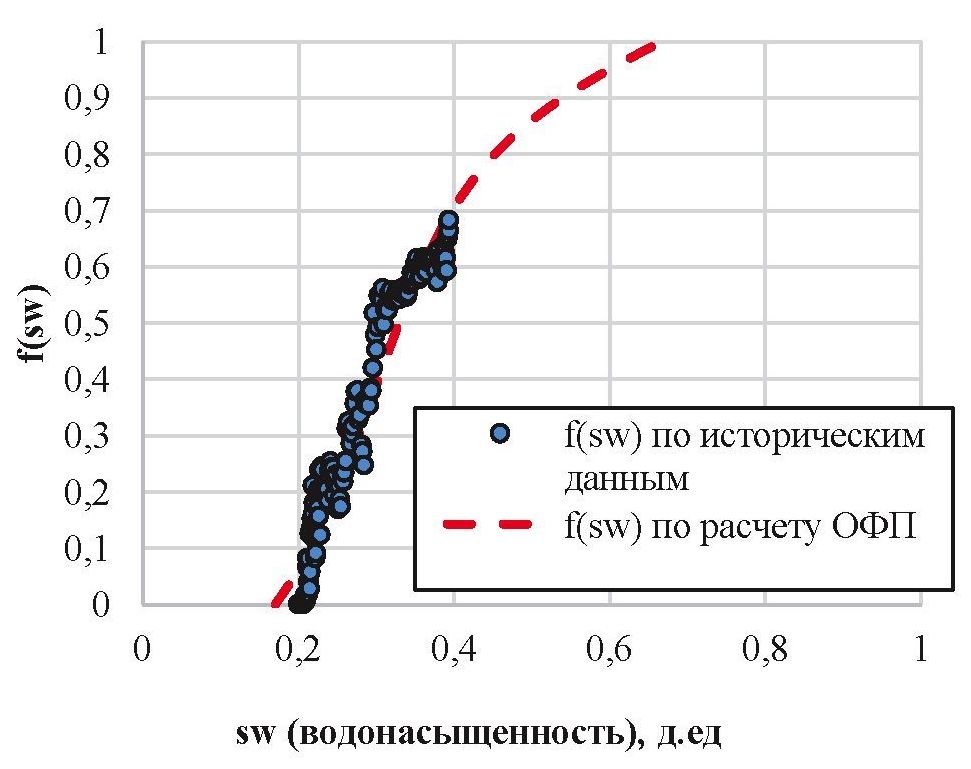 В рамках исследования разработан автоматизированный подход по настройке кривых ОФП для гидродинамической модели, позволяющих наилучшим образом описывать процесс фильтрации флюида в пласте. Сам алгоритм расчетов заключается в использовании функции Бакли–Леверетта. Залежь рассматривается как конечный поровый объем, заполненный жидкостью, при этом в основе фильтрации жидкости заложен принцип материального баланса. Кривая фракционного потока является одной из разновидностей характеристик вытеснения и представляет собой зависимость обводненности продукции от водонасыщенности.