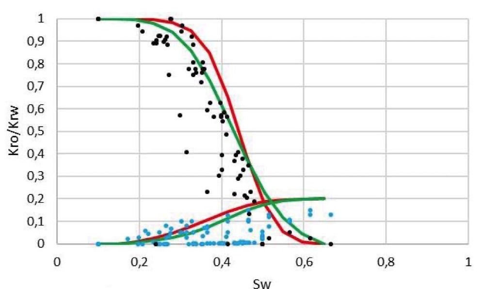 Накопленный опыт моделирования показывает, что использовать напрямую кривые ОФП, полученные по результатам лабораторных исследований, не представляется возможным. Основные проблемы, связанные с таким подходом, – искусственное занижение продуктивности скважин по мере заводнения пласта, быстрое продвижение фронта воды. Существуют различные методики для учета и настройки кривых ОФП в гидродинамической модели. Основной подход заключается в нормировке и аппроксимации результатов керновых исследований [34–36]. Существует множество корреляций, используемых для аппроксимации кривых ОФП, однако на сегодняшний день наиболее популярными являются корреляции Кори и LET (Lomeland, Ebeltoft, Thomas являются авторами методики) [37–39].